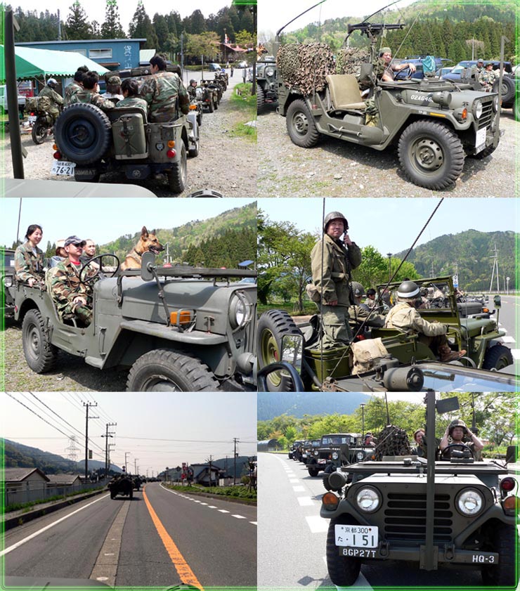 | いよいよコンボイ出発です。今回は、愛知から参加の方々もコンボイ走行に 参加されたので約20台の大コンボイ走行会が出来ました。 連絡将校さんの軍用無線機による連絡姿は、実に格好良かったです。当方は用事で直ぐに帰宅するため コンボイ前に撤収したので変に荷物多すぎ(笑)それに比べシェパードの凛々しい姿は格好いい! |