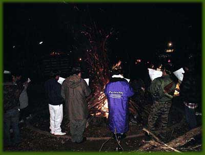 夜の6時からキャンプファイアがあった。各地から集まったMVマニアやその家族の 人たちがキャンプファイアを囲んでみんなで歌を歌ったり騒いだりして盛りあがった。 それまでに参加者の大部分がよっぱらっていたので(出来あがっている人もちらほら?) 余計にその場が盛り上がったのでは・・・? |