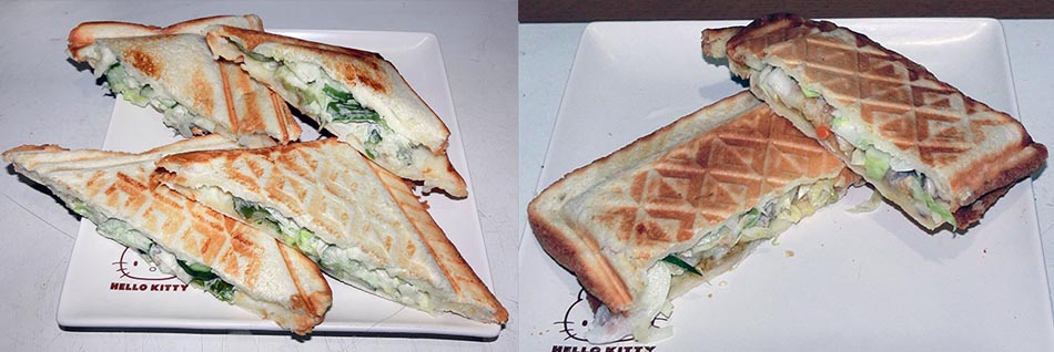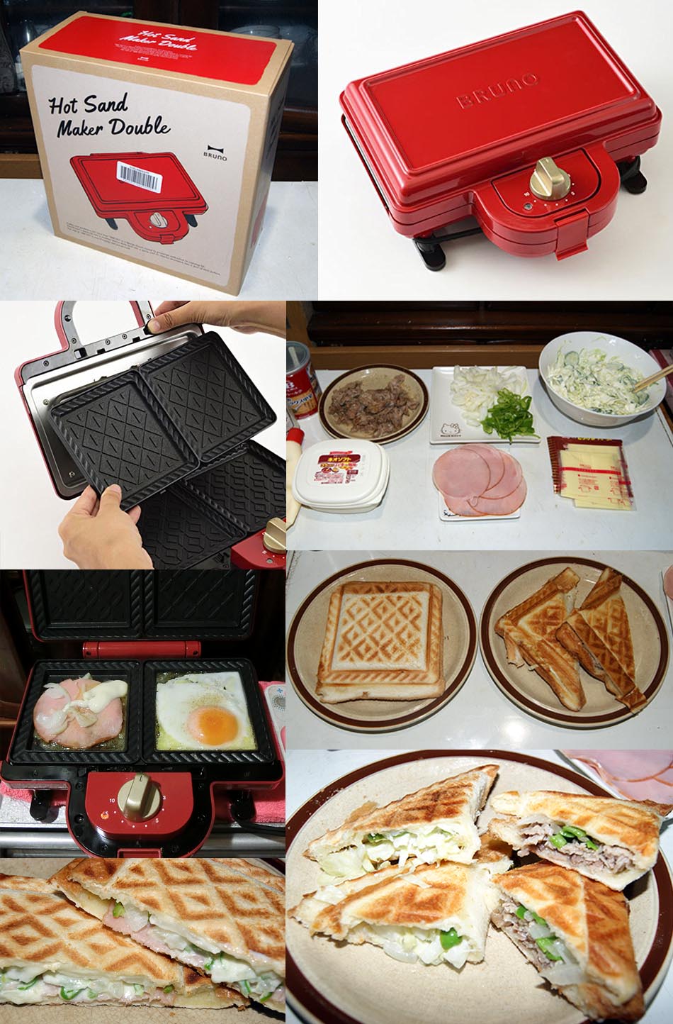 三角サンド奥二枚がビタントニオ、前二枚がBRUNO 長方形二枚、BURUNOで焼いてから二つに切ったもの