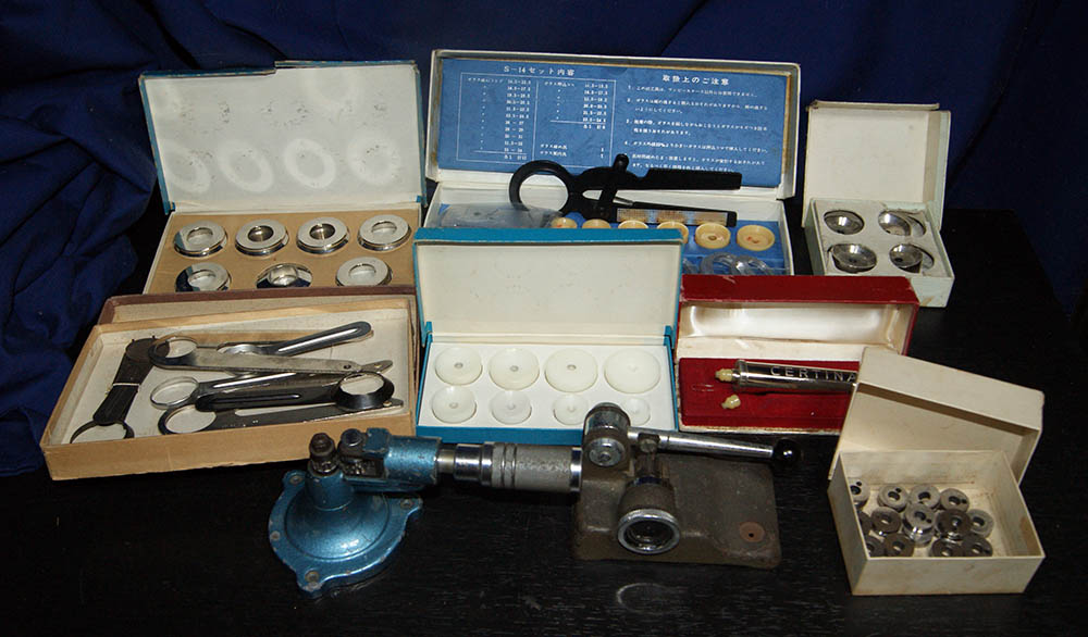 昔に買った安物の時計用工具、右の木箱の物は時計屋で使っているものを会社の先輩から以前わけてもらった品物です。