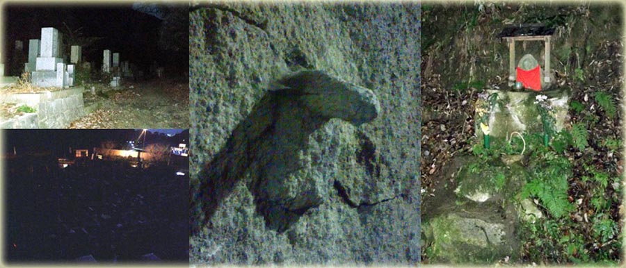 右:墓地へ向かう道、ちょうど真っ暗に写っている部分から墓場になりつつある。急にカラスが飛び出やがったのでびっくりした。