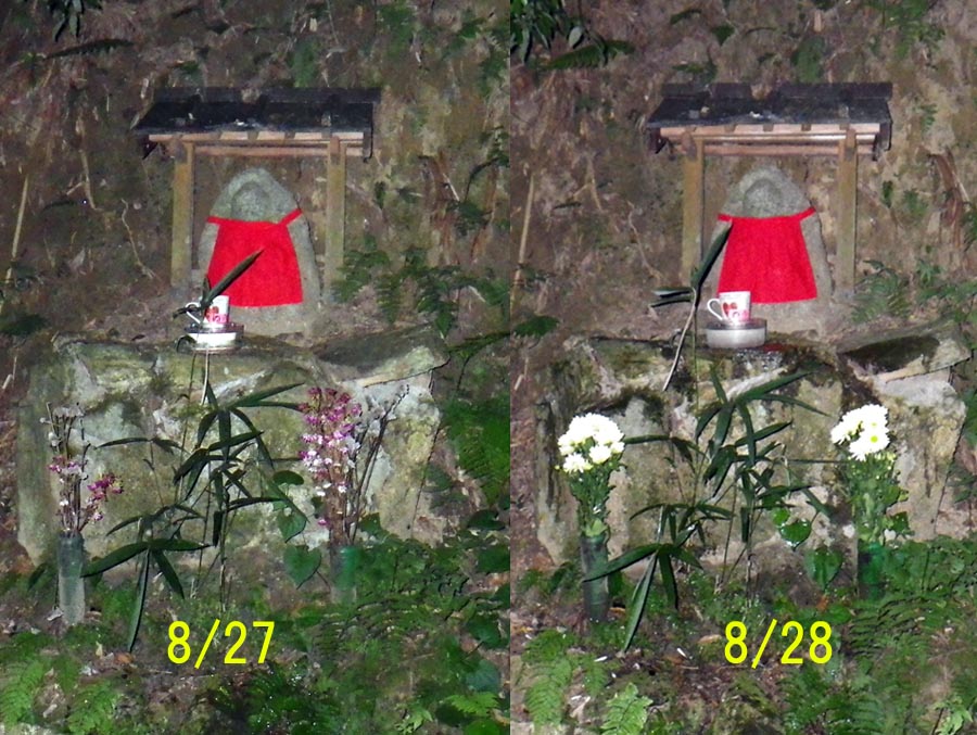 | 27日に涎掛けを替え、28日も歩いて帰るので水、お賽銭等をして記念に写真を撮って帰った。以前は、お金が数十円になると 無くなっていたが、ここのところどんどんたまってきた。当方のお金ばかりやけど・・・(爆)もう200円以上に・・ たいてい、10円〜25円の範囲で置いているんだけど・・・週に多くて3回ぐらい、そして写真を見てみると 27日、28日で活けてある花が違う。しかし花を活ける人は一切水とかは替えない人のようである。 なぜなら当方が替えるまでいつもそのままだから・・・ | |