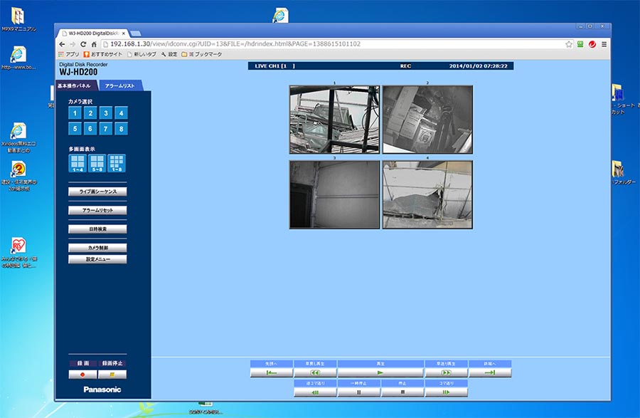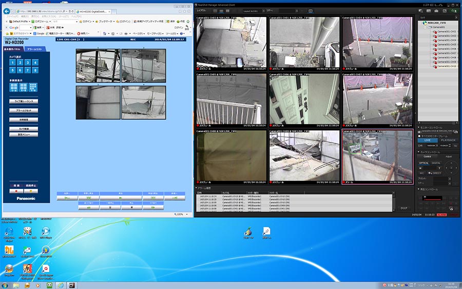 WJ-HD200と同時に監視できるようになった。NSR-1200は16ch入力できるが、本体場所も違うのでカメラケーブルを持ってくるより4台カメラに近い位置にWJ-HD200を置きネットワーク接続にした方が楽だらか2台セットにしております。