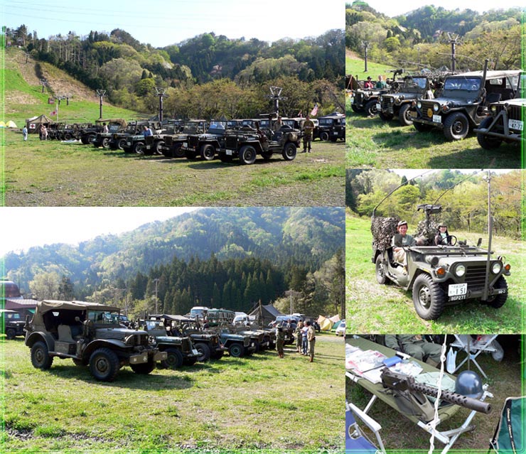 | 今日は、天気も良く、暖かく、みんなノンビリやってます。 年に一回の集まりで、ドレスアップされた車両や新たに参加した車両を見ながらの ジープ談義と言いましょうか?ミリタリー談義と言いましょうか? そこらじゅうで始まってました。でも本格的に始まるのは、夜にアルコール入れて本始動?そう思いませんか?みなさん・・・ |