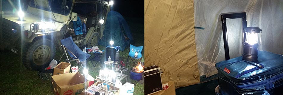 | 今回は、ガソリンやガスランタンをやめてLEDランタンにエネループを入れて 合計13個と懐中電灯LEDとHIDを持ってきました。そしてストーブ類も炭と七輪です。 もちろん火点けには火王を持ってきていますので楽勝で着火できました。 LEDランタンは、火を使わないのでテントの中にも使用できて大変便利です。家にあるもの全て(同じ物) を持ってくれら20個以上になりますが(笑)今回は、これだけです。何か装備も楽な物に変えてきている 自分がいて、軟弱になってきたことが良くわかります。 |