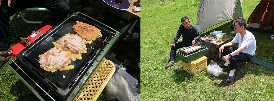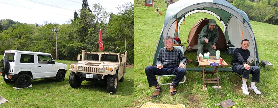 | 会場へ付いて、ウッディパル余呉の事務所でお金を払ってから赤子山スキー場内へ 一般客多く、どこに誰がいるのか不明、ゲレンデ上の方にサンドベージュのハンビー発見!!この車両は 大西氏の友人が買ったと言う車両と思ってそちらへ移動。その通りだった。 その奥で、当方は泊まる事に、荷物降ろして昼飯の用意。いろいろやっていると昼前に・・・平和堂で買ってきた 肉を焼きビールを飲んでいると、大西宅で焼いた美味しいお好み焼きの差し入れがありました。 それを頂きながらの談笑???内容がなぜかしら年金の話。そして話題が変わっても健康の話・・ やっぱりみんな年寄りになった証拠ですね。あと何回おあいできるでしょうか? |