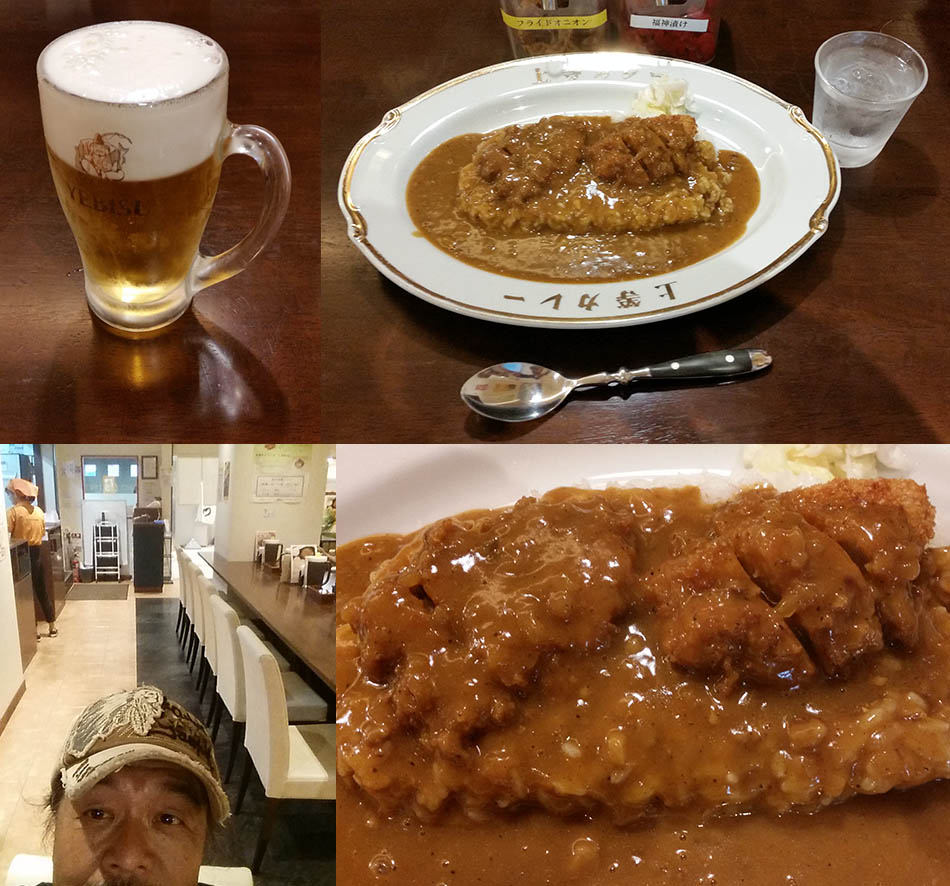 たまらん暑さ、また外環状線へもどってダイゴローの中へ・・・上等カレーへ行って、まず運転しないんだから恵比寿ビール。そしてヒレカツカレー、ご飯大にしました。