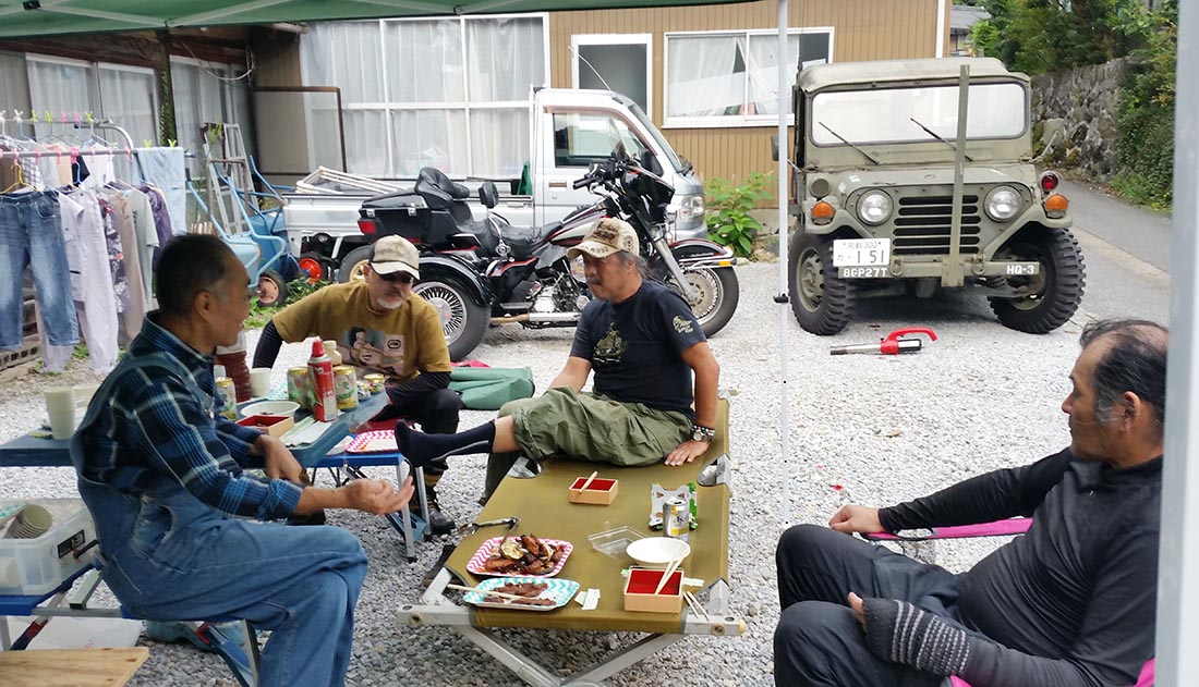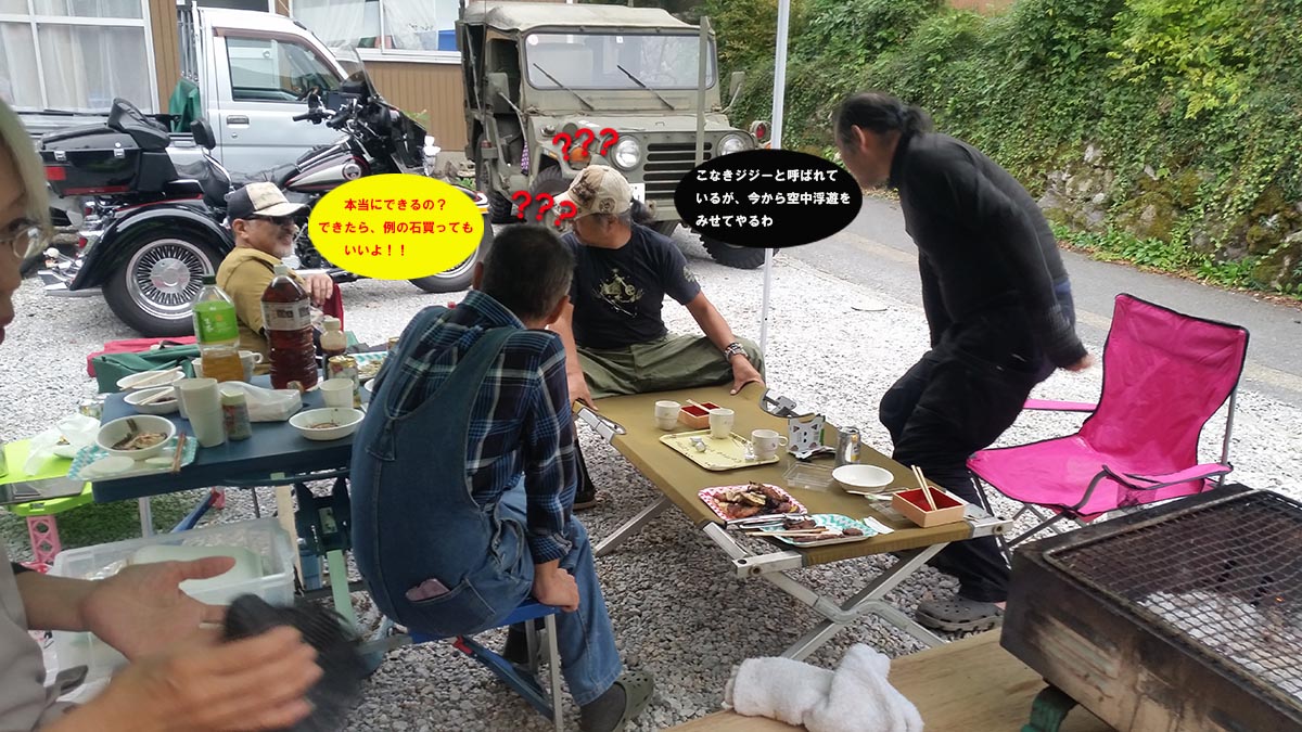 この日の危険な出来事、尊師が信者を増やそうとしているだけでなく幸せを呼ぶ石とやらを売りつけようと スーパーカーしゃかしゃかに積んできていた。それをまんまと罠にかかって福井のおっさんが買わされてしまった。 重さ150kg、値段は、30万円だった。その光景を見て陰から(画像左端)手をたたくひろさんの奥さんが・・・ 一番怖いかも???(爆)当方とひろさんは無言を貫いて難を逃れたのであった。