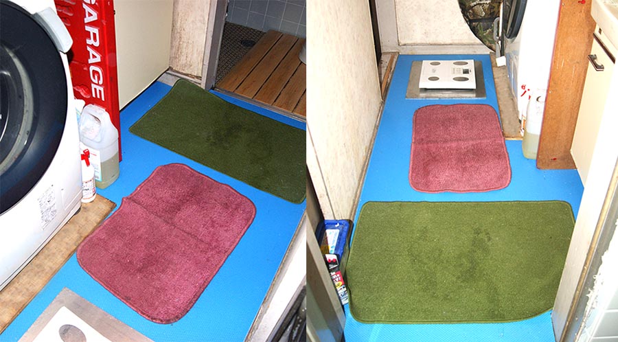 2017/6/22 ツーリングの帰りに、ホームセンターで極厚のプラスチック板を買ってきて場所に合わせて切って敷ました。 これでぬれても大丈夫だし板のササクレが足にささったりしないので安心です。