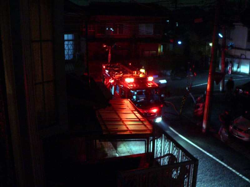 今日、飯を食ってそのあとパソコンをしていたら、午後10時ごろ、けたたましいサイレンとカネの音が・・・ そして火事だと思ってベランダへ出てみると・・・消防車が家の横方向に止まっている?そしてホースを出した。うん・・どこだ・・ またまた消防車、そして場所判明、家の前のワンルームマンション203号室。留守なのか不明だがエンジンカッターで ドアを破壊・・・放水・・救急車は来ない様子?不在中の火事?とりあえずあたり一面に焦げくさい臭いと煙が・・今午後11時であるが、まだ外は同じ状況・・