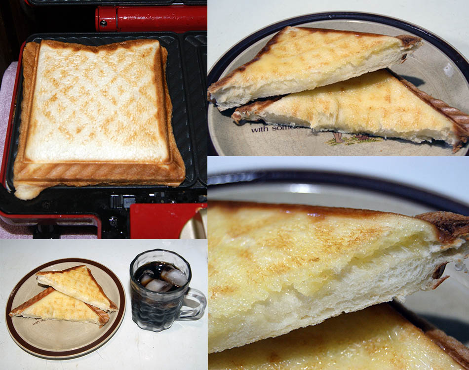 三角サンド奥二枚がビタントニオ、前二枚がBRUNO 長方形二枚、BURUNOで焼いてから二つに切ったもの