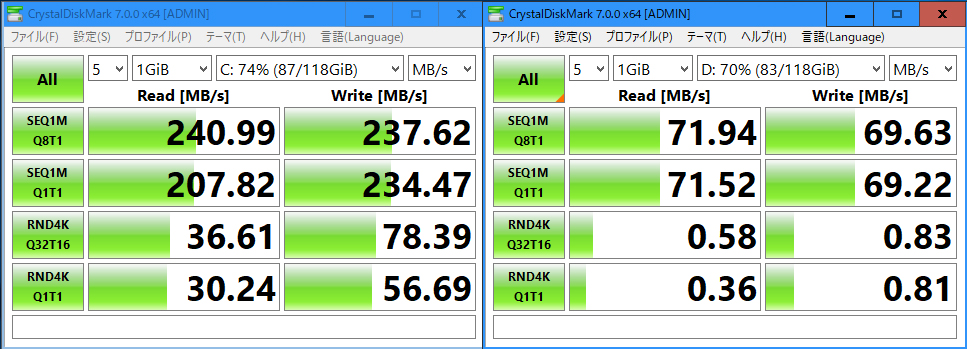 左がSSD、CPUのパワーがもっとあれば500.00以上のスピードはあると思うが現在サクサク動作問題無し。