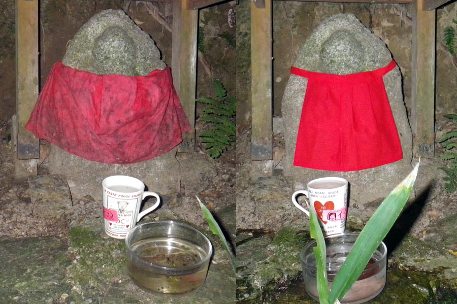 もちろん、水替え、お供えも同時にしてきた。古い涎掛けは、近日中に近くの神社に預ける予定です。 画像左:交換前(去年の物) 画像右:交換後 | |