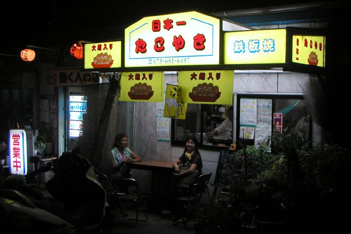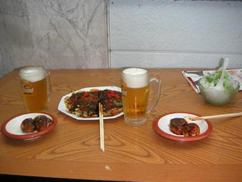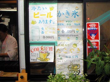 | 生ビール一杯300円、たこ焼き9個300円、九条焼(お好み焼きのモダン焼き風)一枚500円、かき氷一杯100円、 とまだ豚足とか色々あるけど、とりあえず良心価格、そして美味い。この日は、生2杯、たこ焼き一皿、九条焼一皿、 かき氷一個、合計1,500円で三人満足して帰りました。みなさんも是非一度行ってみて下さい。 | ||